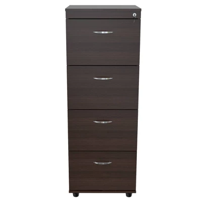 Uffici File Cabinet Collection by Inval finished in a rich “Espresso” laminates in durable melamine which is stain, heat and scratch resistant. Constructed from manufactured wood. This commercial grade vertical mobile unit has a functional modern design that is an excellent choice for your home office or office. The front edge of the file and drawer front panels have 1mm edge banding. The unit features four file drawers that can accommodates both letter or legal sized files, and has full extension slides. All drawers have brushed metal handles and a locking mechanism for added security. It rests on four gliders for added stability.