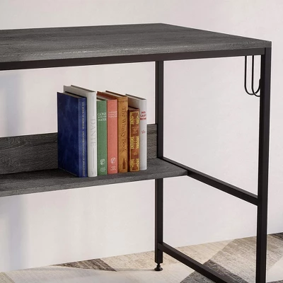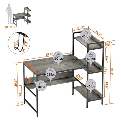 The Bestier Computer Desk with Storage Shelves turns any room into an office space for students, writers, artists, or professionals of any kind.This work desk includes a 3-level reversible storage shelf that attaches to either side of the desk depending on what is most comfortable and ergonomic for you. Built-in sideboards on the shelves help keep your books, office supplies, and decorative accents onboard. A headphone hook attached to the side of the desk keeps your headphones conveniently within reach without taking up surface space. Use the under-desk storage shelf to keep study materials, books, and important documents easily accessible without cluttering your workspace.Built with a sturdy steel frame and lightweight, durable P2 furniture-grade particleboard wood, the desktop surface supports up to 100 pounds, while the hutch undershelf supports 25 pounds. Each level of the bookshelf supports 40 pounds; the headphone hook supports 10 pounds. A handsome finish emphasizes the modern look, help it fit into your contemporary office or home.Ideal for students and professionals alike, the Bestier Computer Desk with Storage Shelves make sure you stay organized and on task in style.