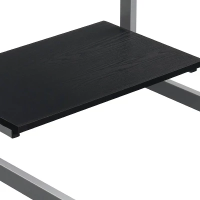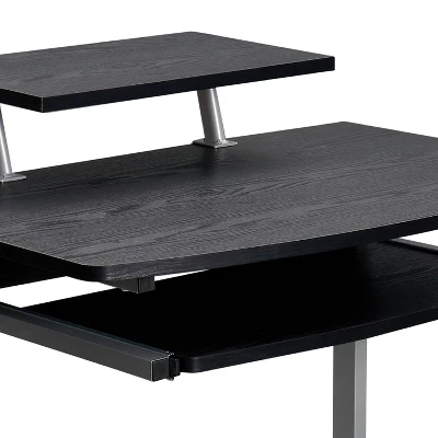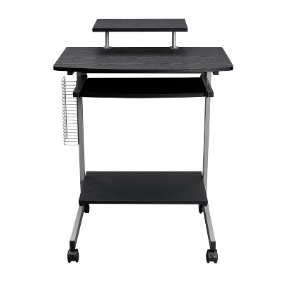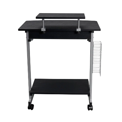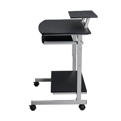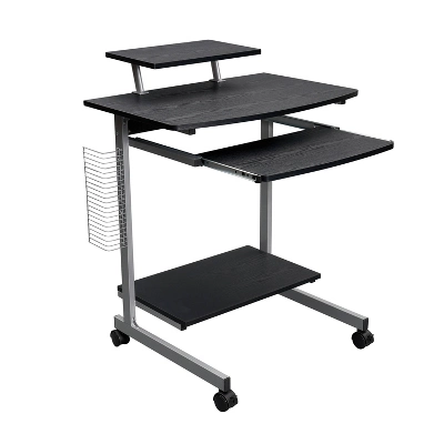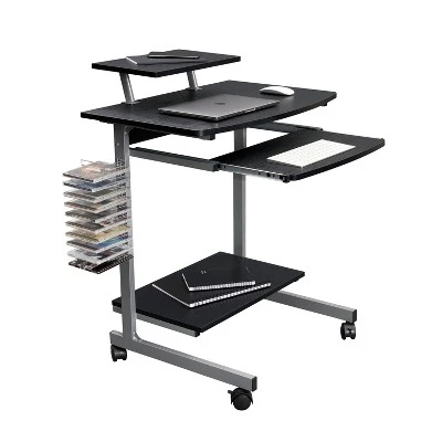 This Techni Mobili Compact Computer Cart is made with heavy-duty engineered wood panels with a moisture resistant PVC laminate veneer and a scratch-resistant powder-coated steel frame. The adjustable shelf can be mounted center, right or left of desktop. It also features a slide-out keyboard shelf equipped with a safety stop, side media rack for CDs or DVDs, bottom accessory shelf, large bottom shelf to accommodate a CPU and accessories, and large double-wheel non-marking locking casters. The desktop has a 100lb weight capacity, the shelves each have a 30lb weight capacity, and the keyboard shelf can hold up to 20lbs. Color: Graphite