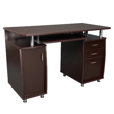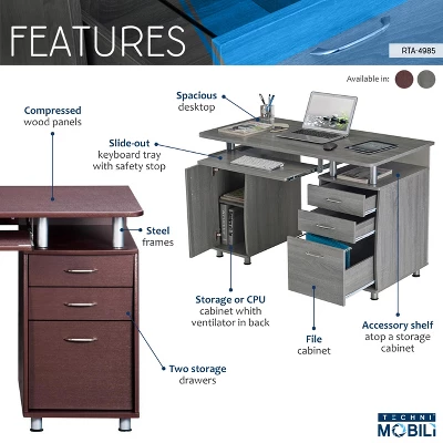 This Techni Mobili Desk is a complete workstation offering an ample work surface and plenty of storage space. It features an accessory shelf atop a storage cabinet, a keyboard panel equipped with a safety stop, 2 drawers and a file cabinet. The CPU/Storage cabinet not only has a removable shelf that can be pleased up, down or completely removed but also has a large back opening for cables. The desktop has an 80lbs weight capacity, while the shelves can each hold up to 30lbs, and the drawers each have a 22lbs weight capacity. This elegant desk is made of heavy-duty MDF panels with a moisture resistant PVC laminate veneer atop scratch-resistant powder-coated steel supports. Color: Chocolate.