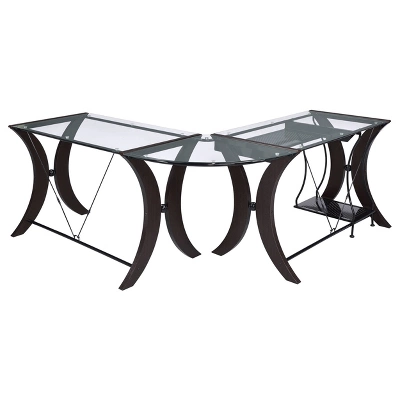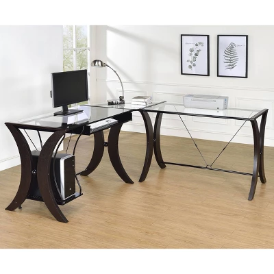 This contemporary, three-piece computer desk is an effortless blend of glamour and functionality. Its base is composed of gracefully curved metal lines for a smooth, sleek silhouette. Finished in gorgeous shades of cappuccino and glossy black, it boasts a truly elegant look. A clear tempered glass top adds a pleasing touch of shine. This desk features a built-in CPU stand and keyboard drawer for your convenience.