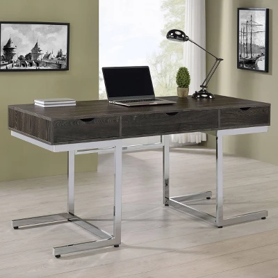 Created with a dark oak finish, this contemporary writing desk offers a bold statement piece to any room. A rectangle tabletop with three drawers appears to float, supported by a trestle-inspired steel frame. The steel frame also features a chrome electroplated finish that offers a lustrous gleam that adds a striking contrast. Each of the three drawers features a flush front panel free of hardware and are attached to full extension glides for a smooth operation. Perfect for a transitional or industrial style home office, this writing desk lends a chic, glamorous touch.