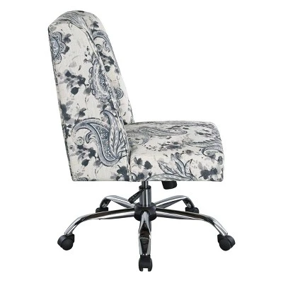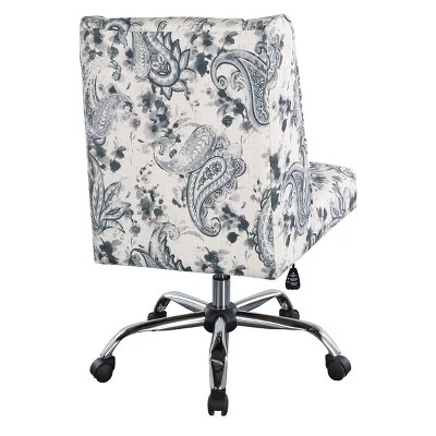 Elegant lines and trending paisley fabric will create a sophisticated focal point in your home office. The high back, modified wingback design and padded seat offer exceptional comfort even while working long hours. The 360º swivel allows you to glide easily from task to task and the one-touch seat height adjustment allows for perfect positioning. A polished chrome 5-star base and dual wheel casters offers durable style. Easy 3-step assembly makes this office chair a dream to own.